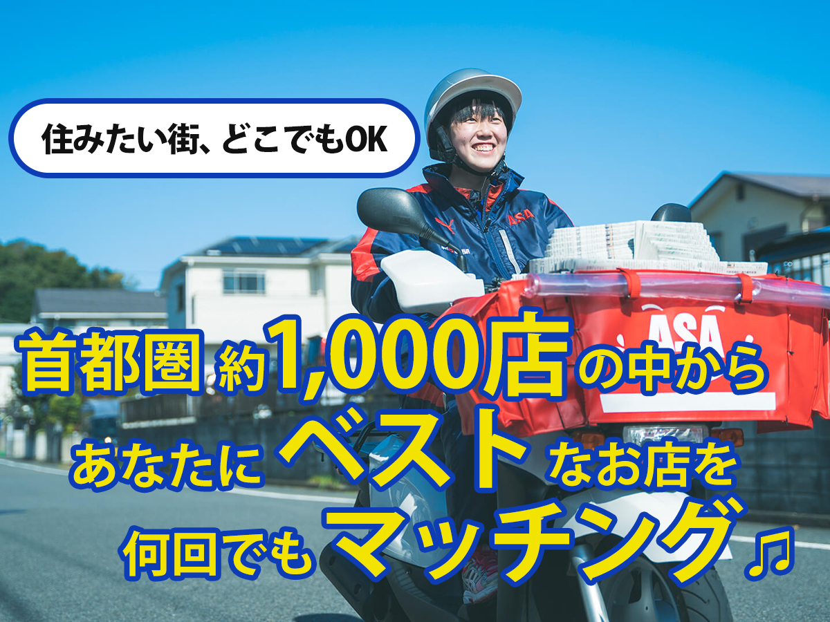 首都圏【東京23区・多摩・神奈川・埼玉・千葉・栃木・群馬・茨城 他】のASA(朝日新聞販売所)約1,000店舗の中から『希望』にそってご紹介します。
